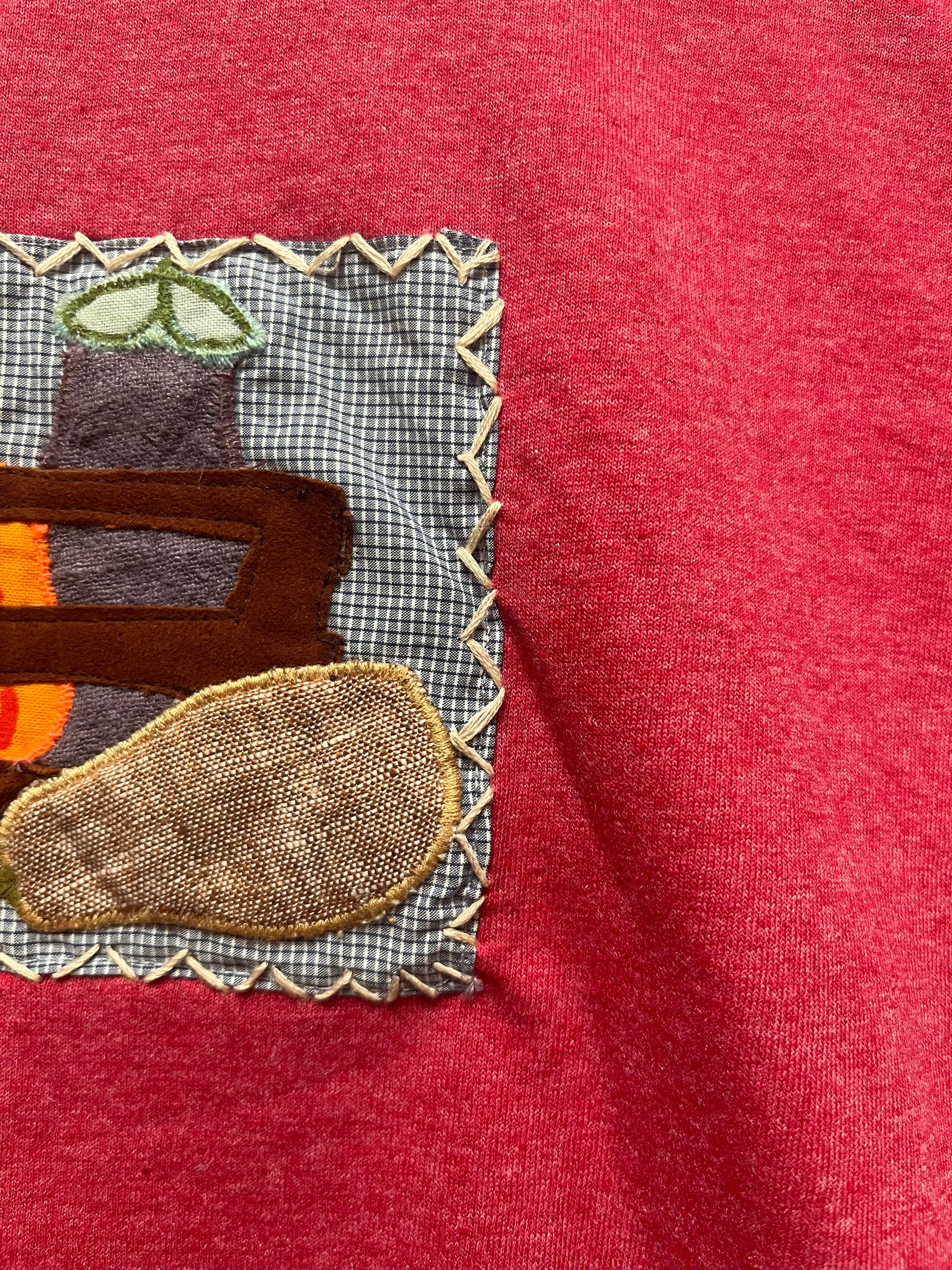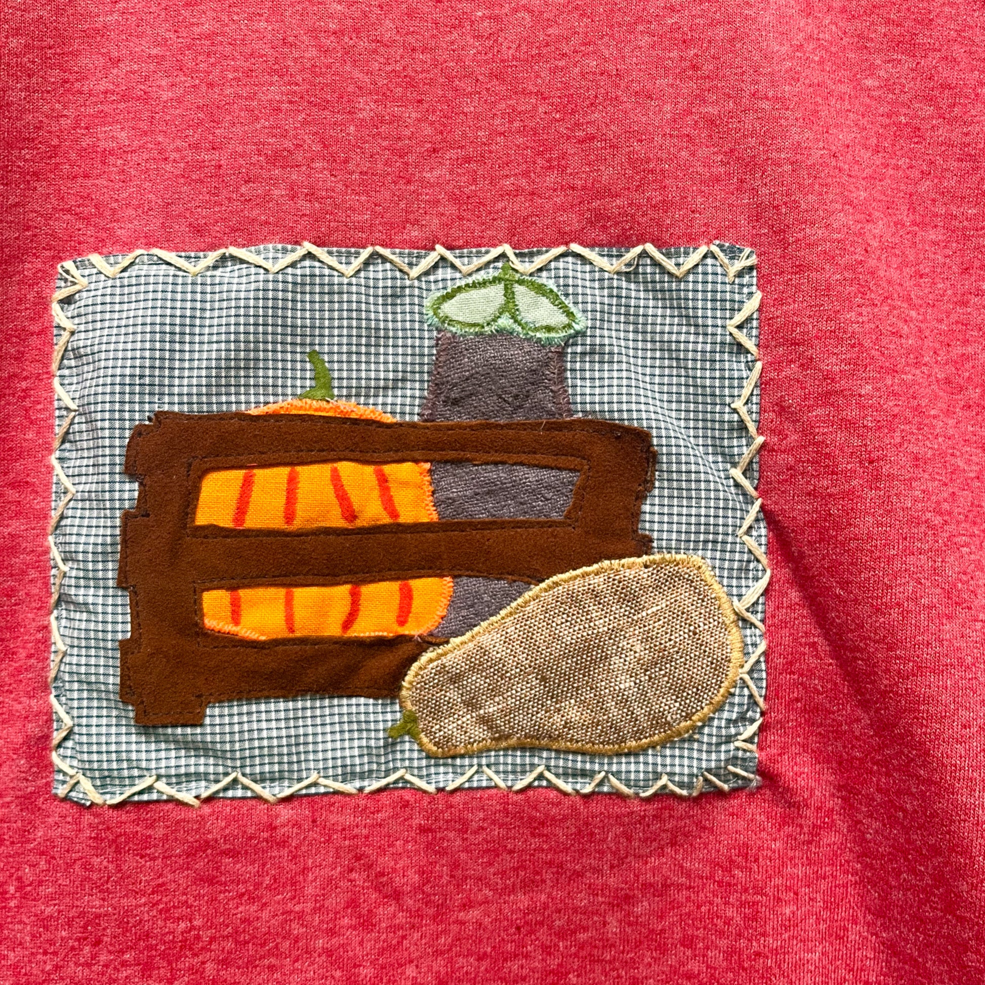 Patch motif Courges dans une cagette artisanal fait en France composé d'appliqués de tissu, de broderie et de peinture textile. Fond en upcycling chemise